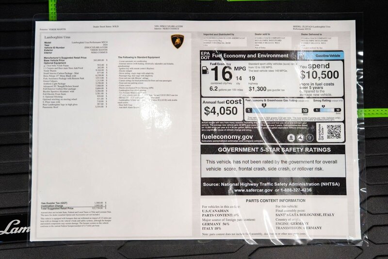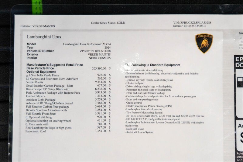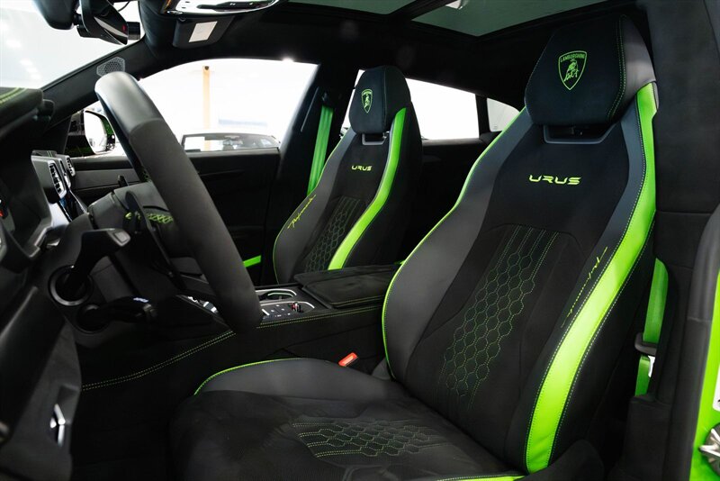 2024 Lamborghini Performante Urus Clean CARFAX. Verde Mantis Metallic 4.0L V8 Twin Turbocharged AWD Seat Belts Verde, Floor Mats Nero/ Verde, Vented Seats, Heated Seats, Massage Seats, 1 Owner, Advanced 3D Bang & Olufsen Sound System, Ambient Light Package, Bicolor Sportivo Alcantara Seat Upholstery, Ceramic disc brakes: front and rear, Full Exterior Carbon Fiber Package - Shiny, Green Calipers, Panoramic Roof, Park Assistant Package, Small Interior Carbon Package - Matt, Wheels: 23'' Pelope Shiny Black.